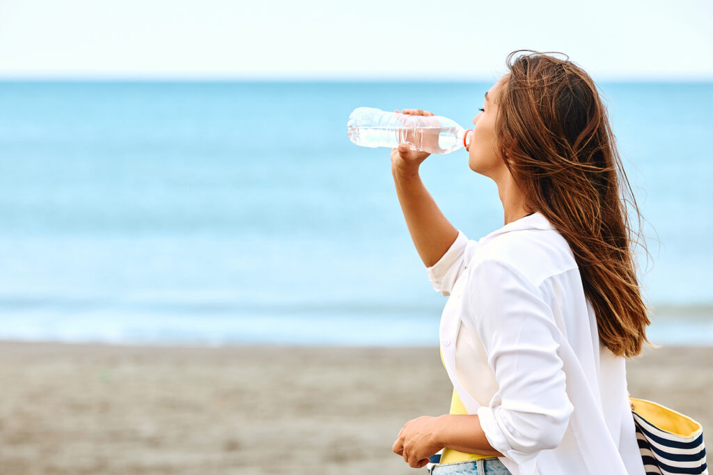 Avec la chaleur, notre corps perd davantage d’eau du fait de la transpiration. L’hydratation devient donc encore plus importante que d’habitude. Avoir toujours une bouteille d’eau (ou une gourde) sous la main vous permettra de vous hydrater régulièrement au fil de vos journées.