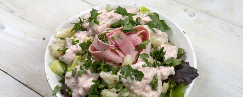 Salade de chou-fleur aux radis et oeufs durs, dressing au yaourt
